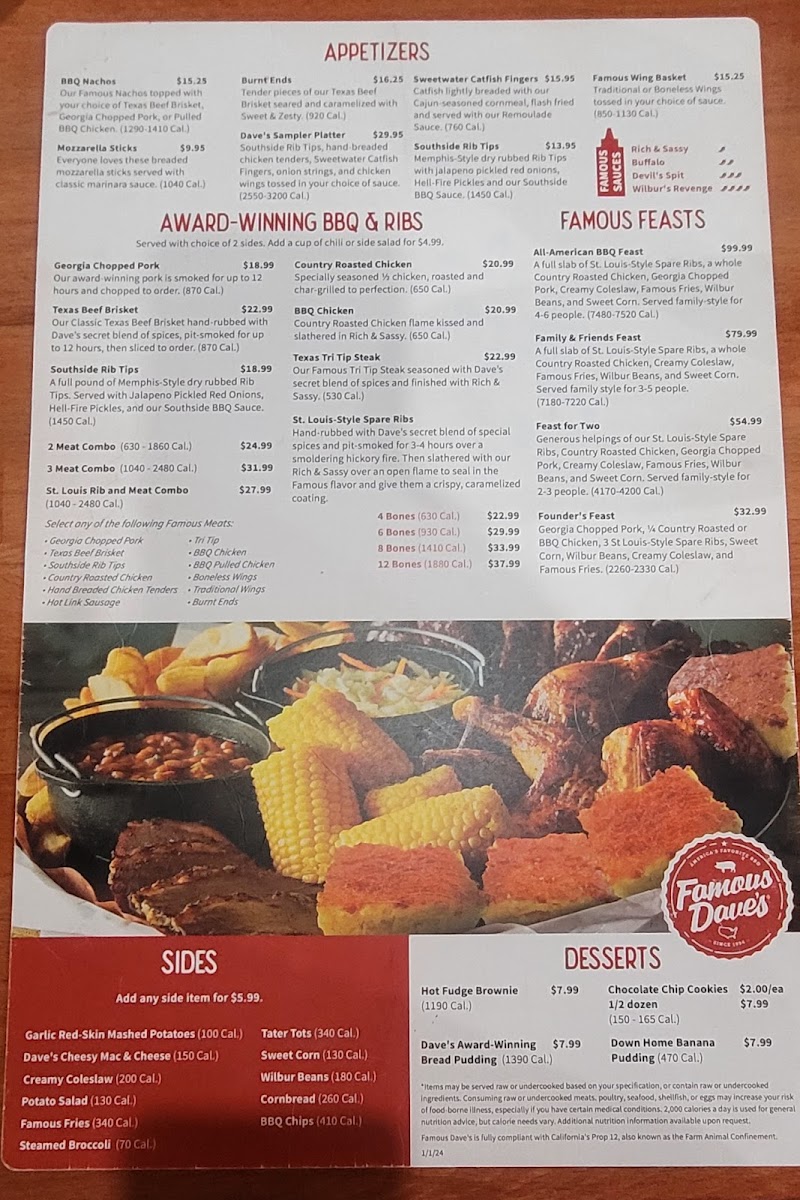 Customers rave about the fun atmosphere reminiscent of a northern lodge and the excellent service from staff like Kat and Onie, making every visit memorable. With delicious food and a welcoming environment, you’ll find it hard not to return for more. Come savor the rich flavors that have made Famous Dave's a cherished destination!